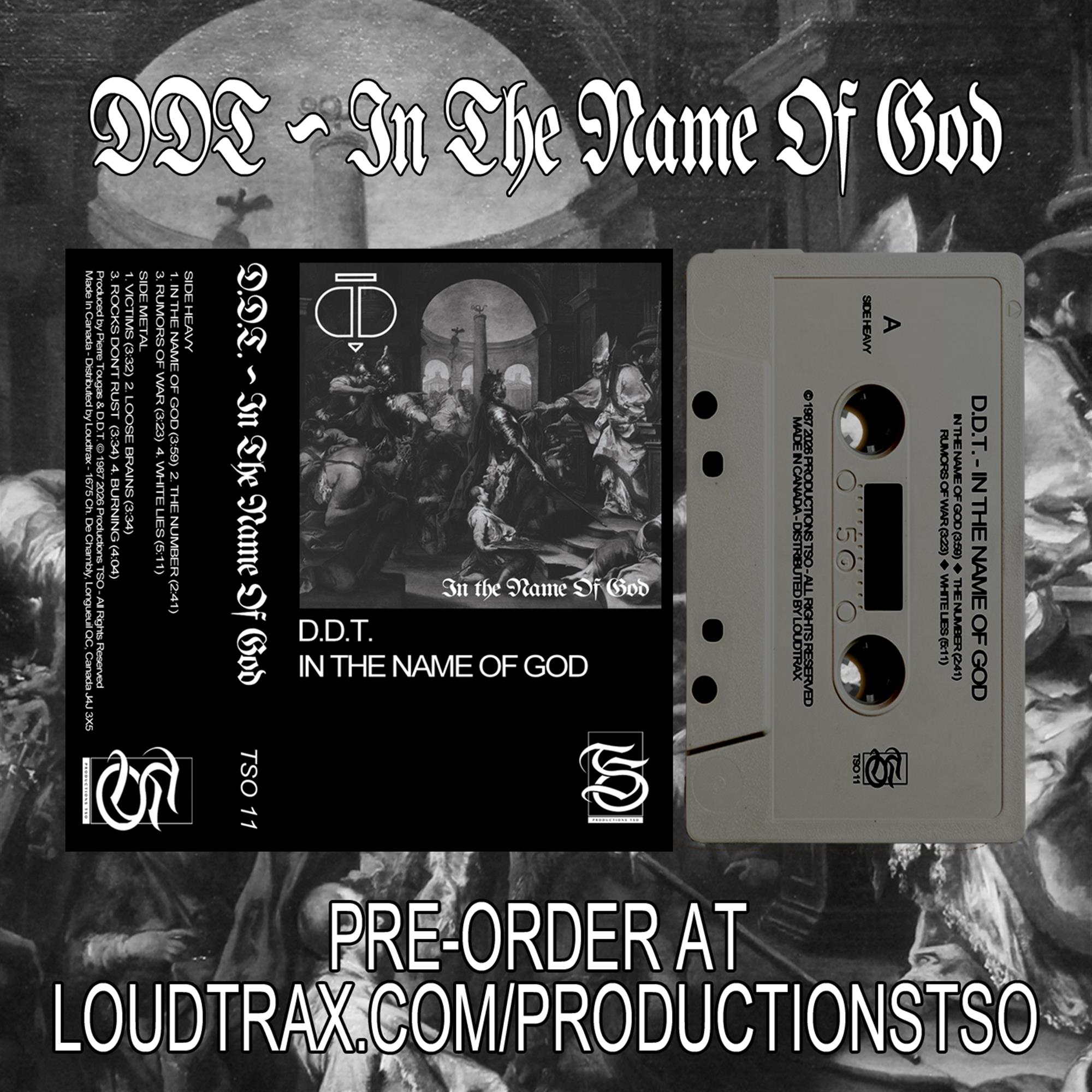 'In The Name Of God was recorded and mixed in Sherbrooke on a Fostex 14 inch 8 track recorder inside our rehearsal studio. We recorded 10 additional songs that did not end up on this demo, because we felt they were going in a different direction. Some of them were released on the following `Victims` demo tape. Following the lack of interest from record labels, and the fact that the EP and touring was out of breath since its release, Denis and SYD parted with us to pursue other ventures. We auditioned drummers as we realized that we could also function as a power trio with a lead singer. We hired Richard Pérusse, a DDT fan with a lot of drumming experience, who loved heavy metal and was a connoisseur of the genre. We later started the club gigs once again to polish our style and evolution into the genre. This demo was a prelude to the `Victims' demo recorded months later".