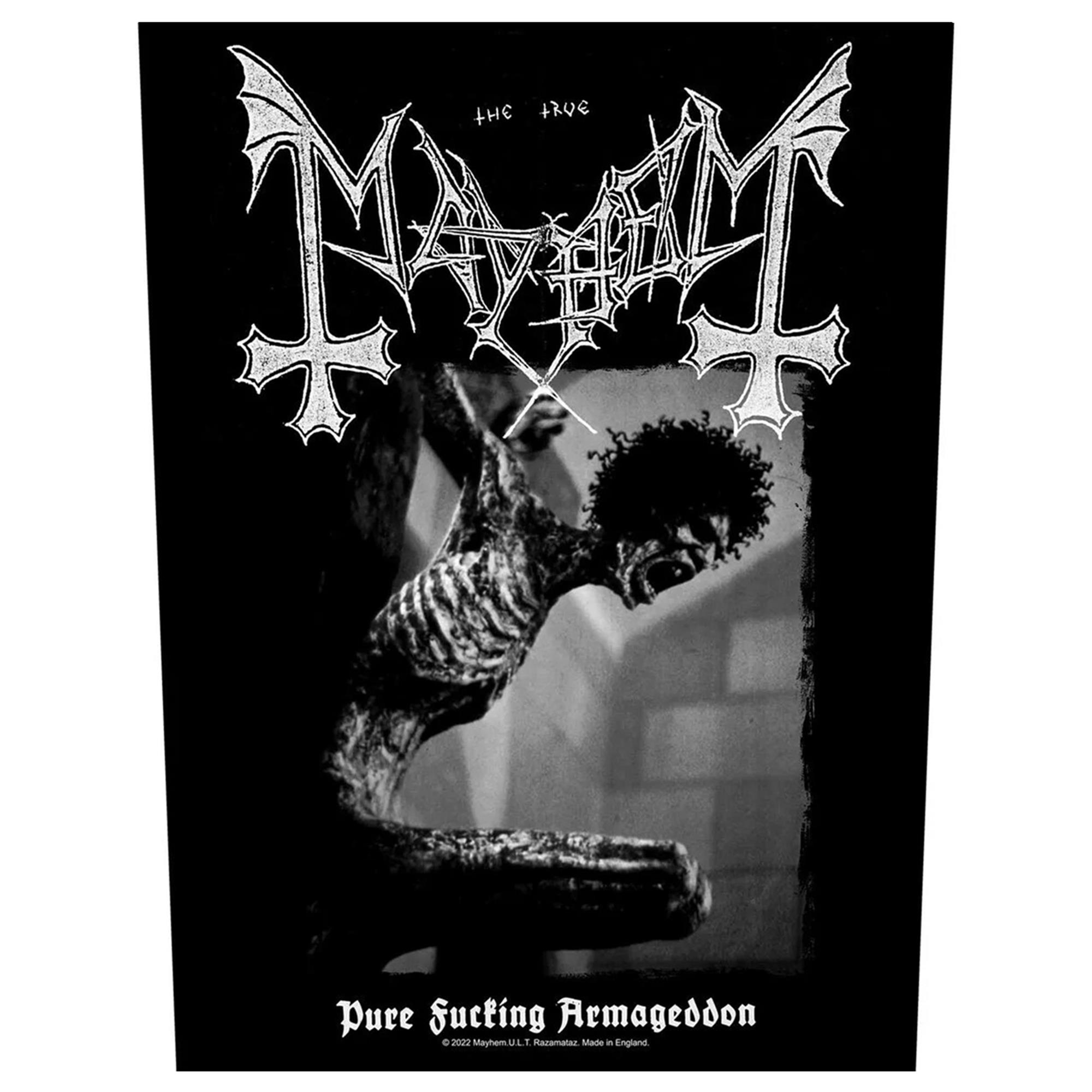 This killer backpatch features artwork inspired by Mayhem's 1986 album, Pure Fucking Armageddon.